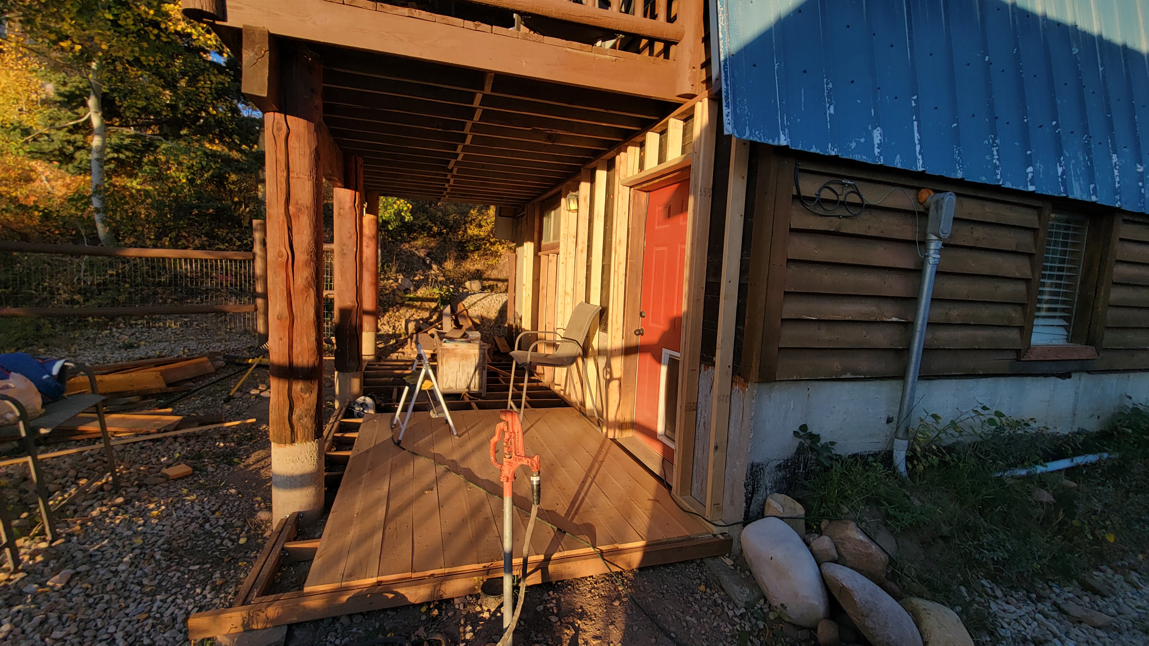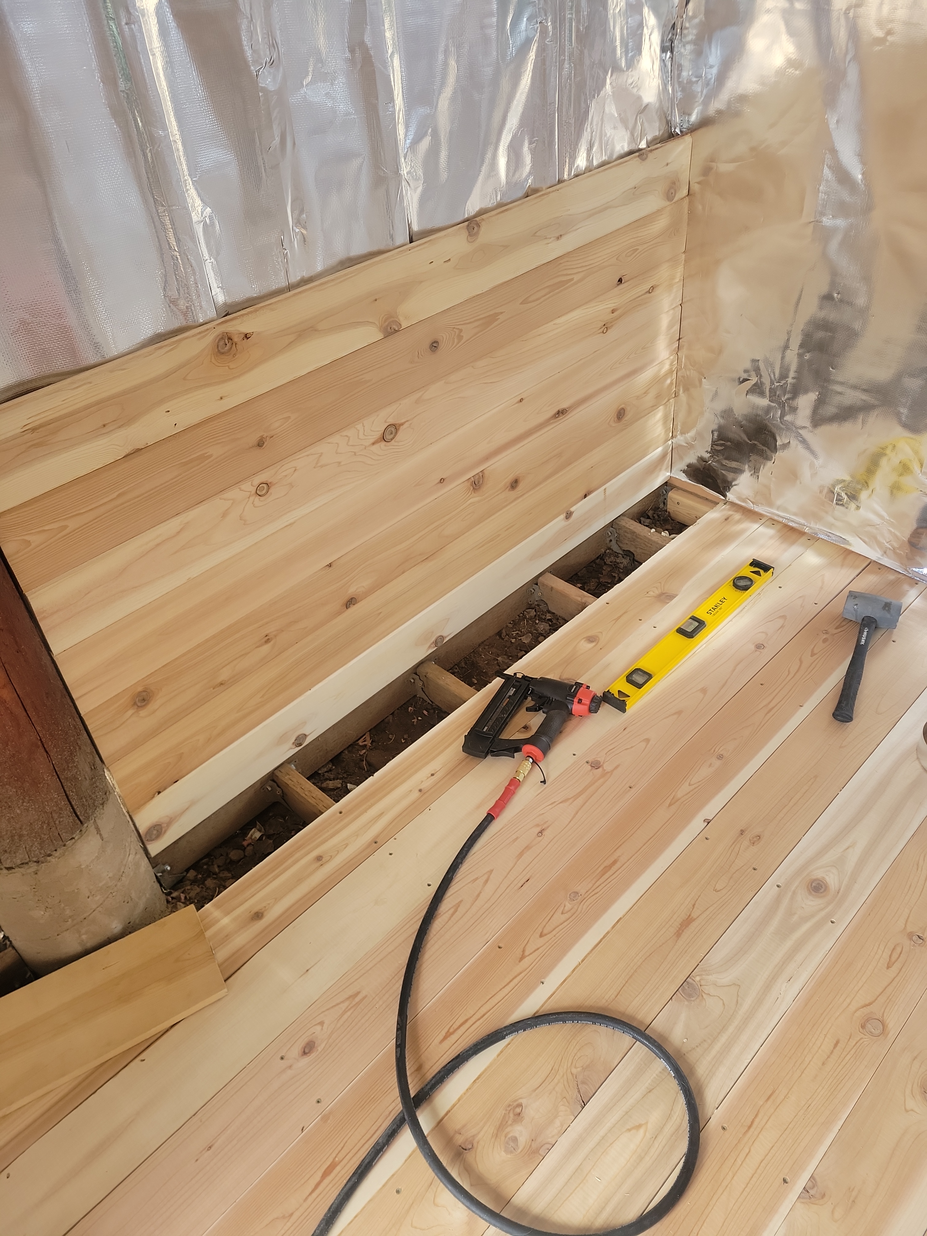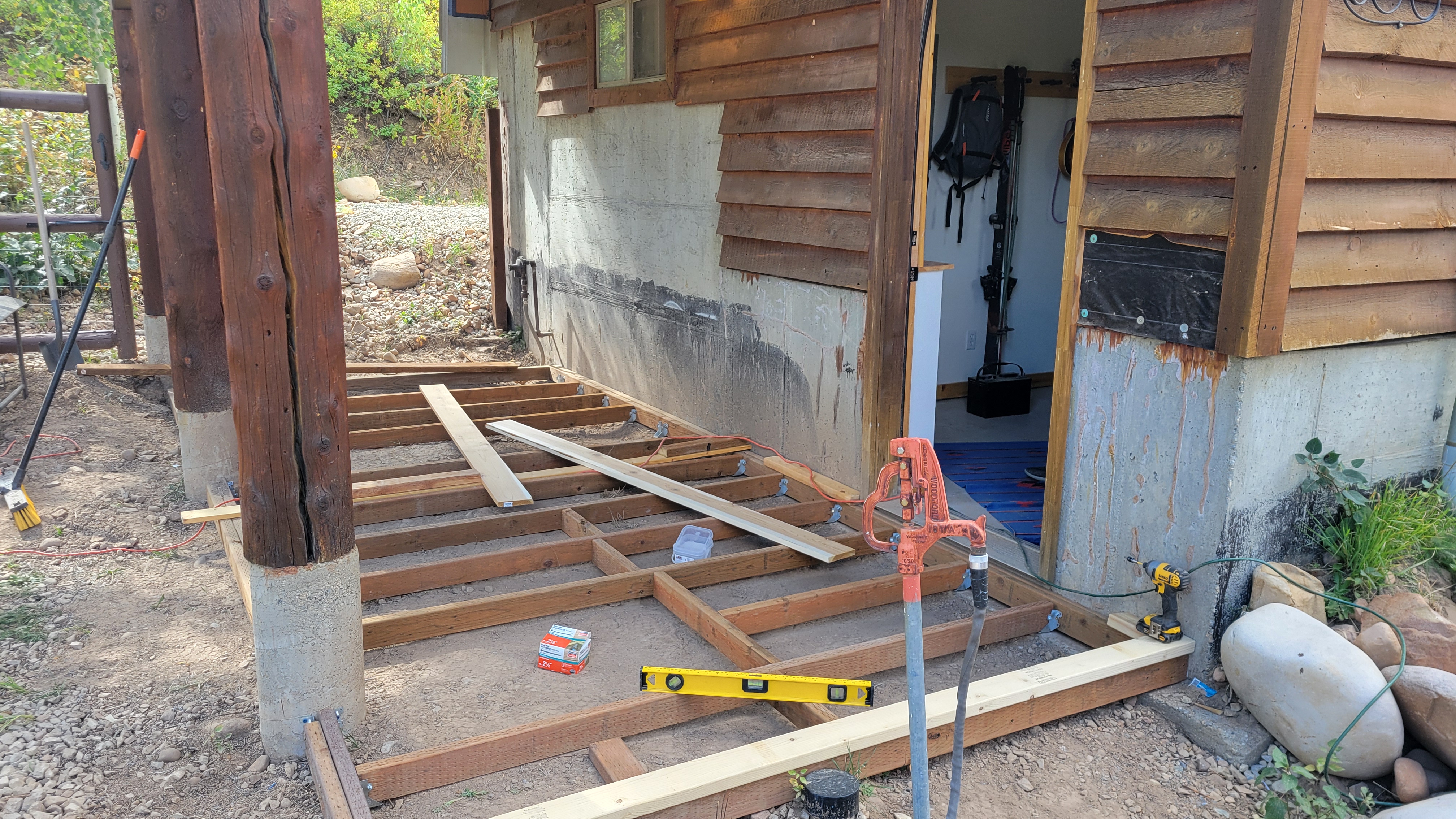 In addition, the site location under the deck resulted in a need for a sloped water shedding design. Finally, there was the sauna room itself. Design criteria were sourced with significant input from Trumpkin’s notes on a sauna build. So big thanks and shout-out to Trumpkin for providing that resource. There was a focus on ensuring the room would not be too large, so a changing room was added to half of the site footprint. This will eventually become an enclosed three season screen porch.