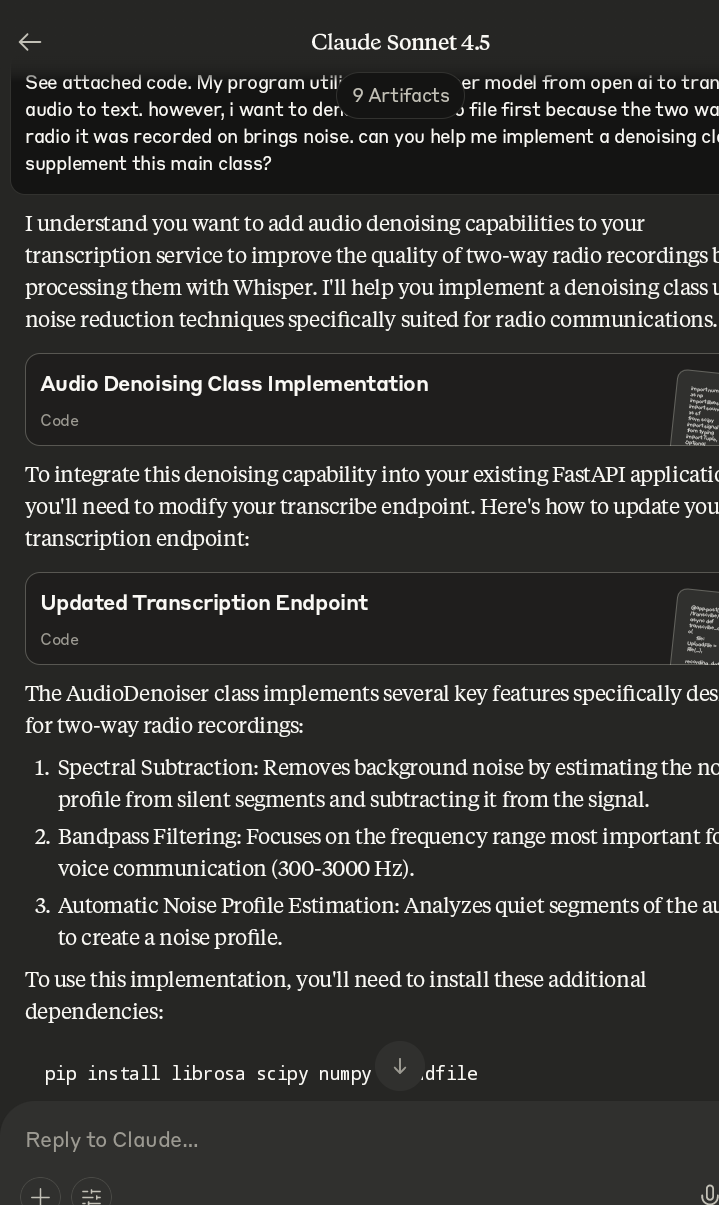 Denoising the audio involved adding a new class that added spectral subtraction, bandpass filtering, and automatic noise profile estimation.