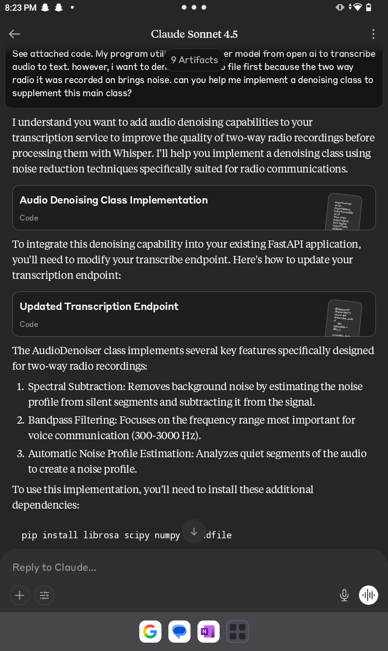 Denoising the audio involved adding a new class that added spectral subtraction, bandpass filtering, and automatic noise profile estimation.