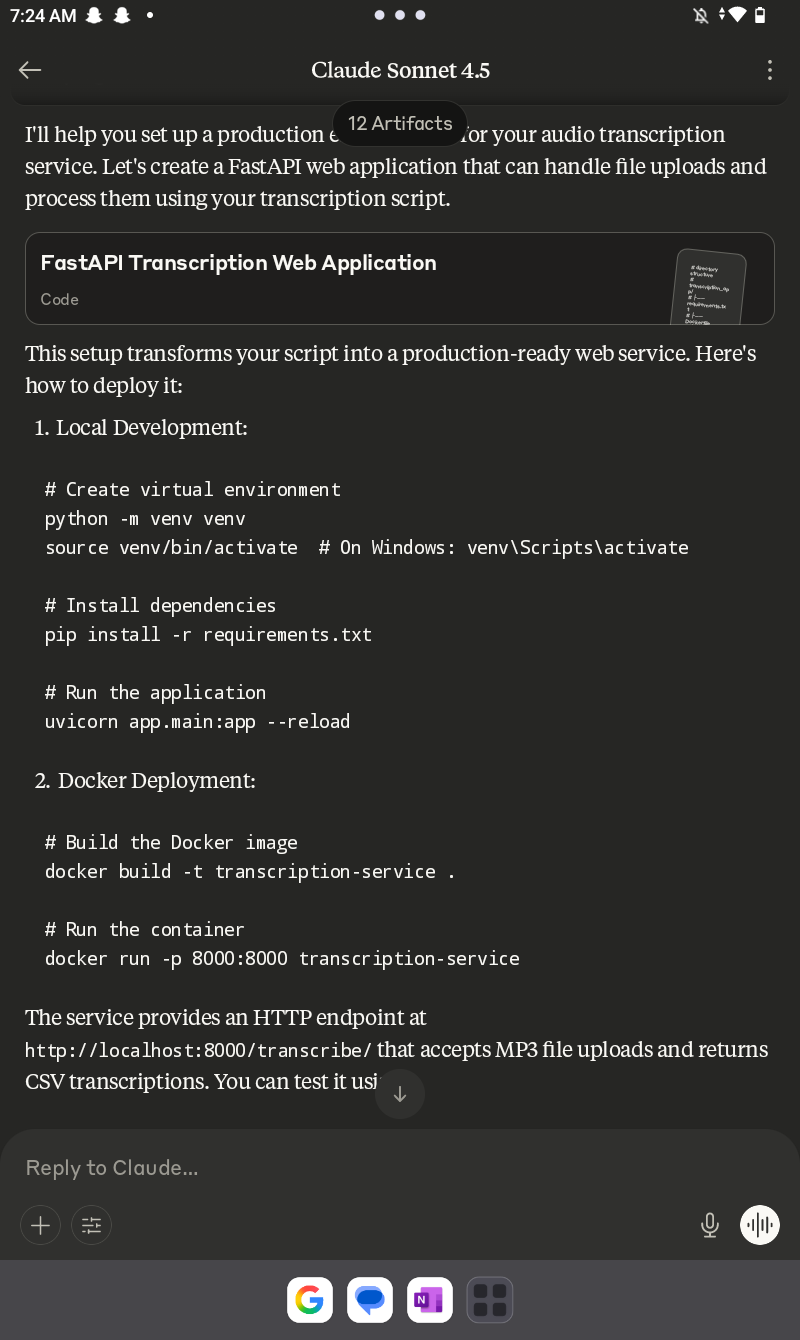 I built out the code in PyCharm, adding the functions for loading the Whisper model, file uploads via FastAPI, conversion to .csv format, and final delivery to the FastAPI.